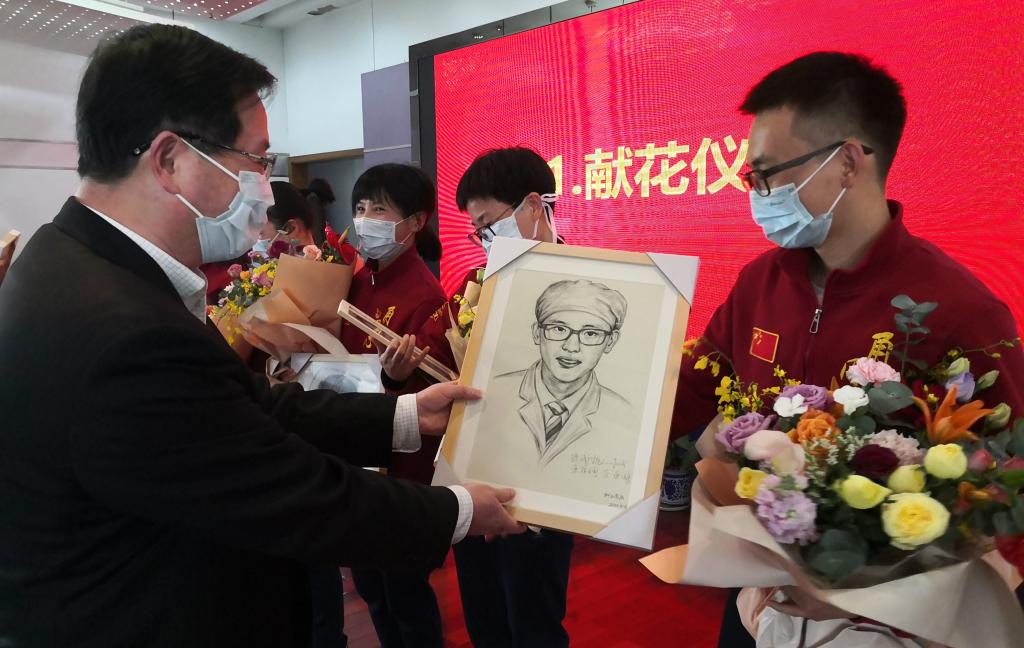 仪式上,薛维海、冯志敏、邵千钧、张真柱向全体援鄂医疗队员、支援宁波本地抗疫的医疗队员代表献花。驰援武汉的医护人员上台接受鲜花,每位队员同时还收到了一份特别的礼物——一幅援鄂工作状态的个人素描画,上面写着“医往无前,英甬归来”的字样。据了解,这是久久精品一区二区医学院附属医院/久久精品一区二区中澳MBA校友会和久久精品一区二区潘天寿艺术与设计学院共同策划制作、赠送给每位医疗队员的特殊的抗疫纪念。